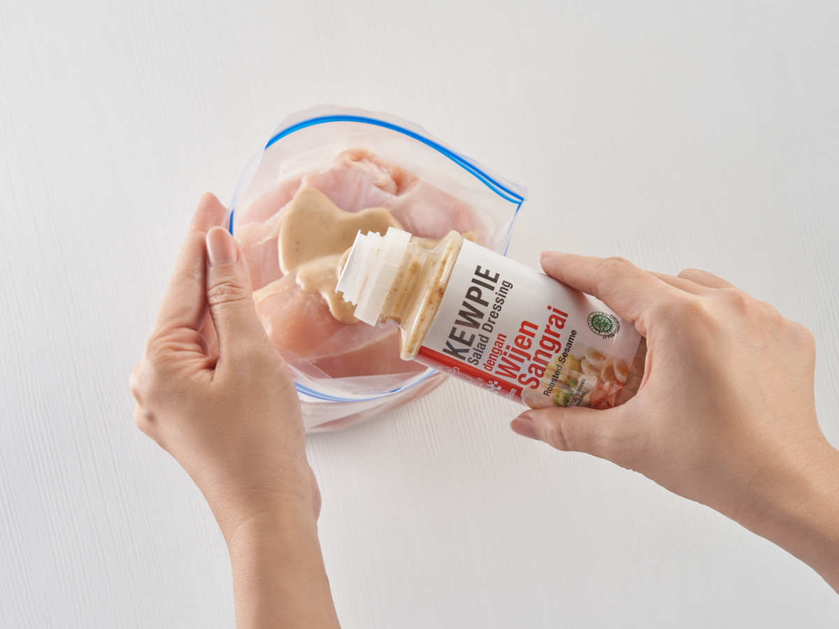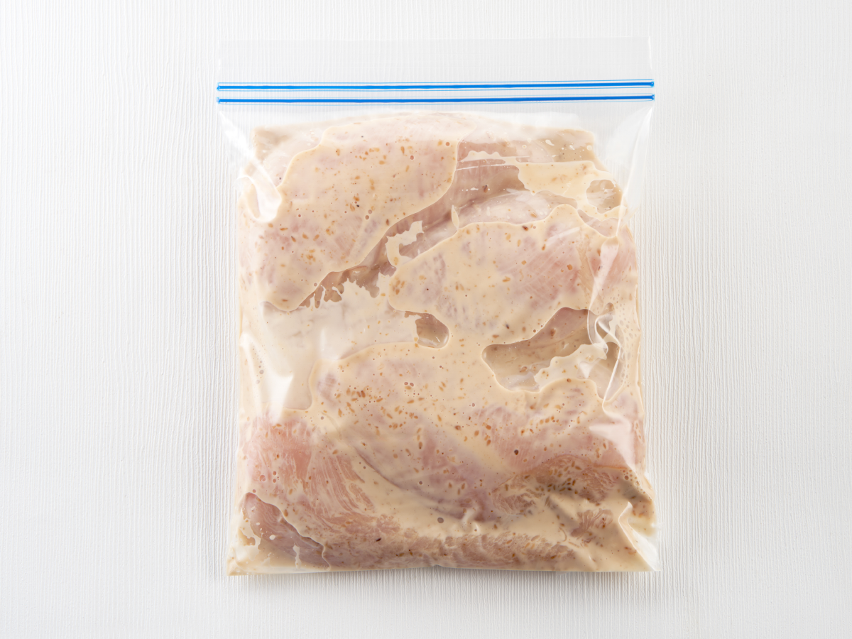 Remas daging ayam hingga dressing merata. Pipihkan daging hingga udaranya keluar, tutup plastik dan simpan di dalam freezer.